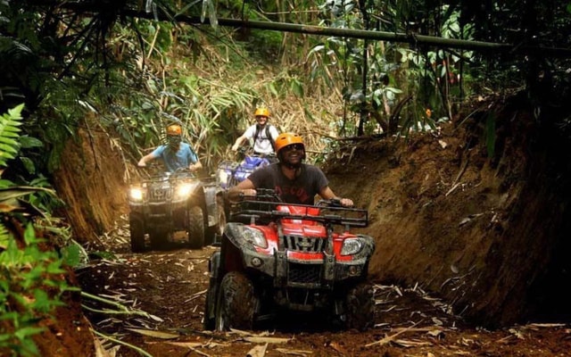 Erlebe ein ATV-Quadbike-Abenteuer bei Alasan Adventure Ubud! Fahre durch die Gorila-Höhle, den Dschungel, die Flüsse und den Schlammpool und entspanne dich anschließend in der Cretya Sunset Pool Bar Ubud mit Blick auf die Reisfelder.