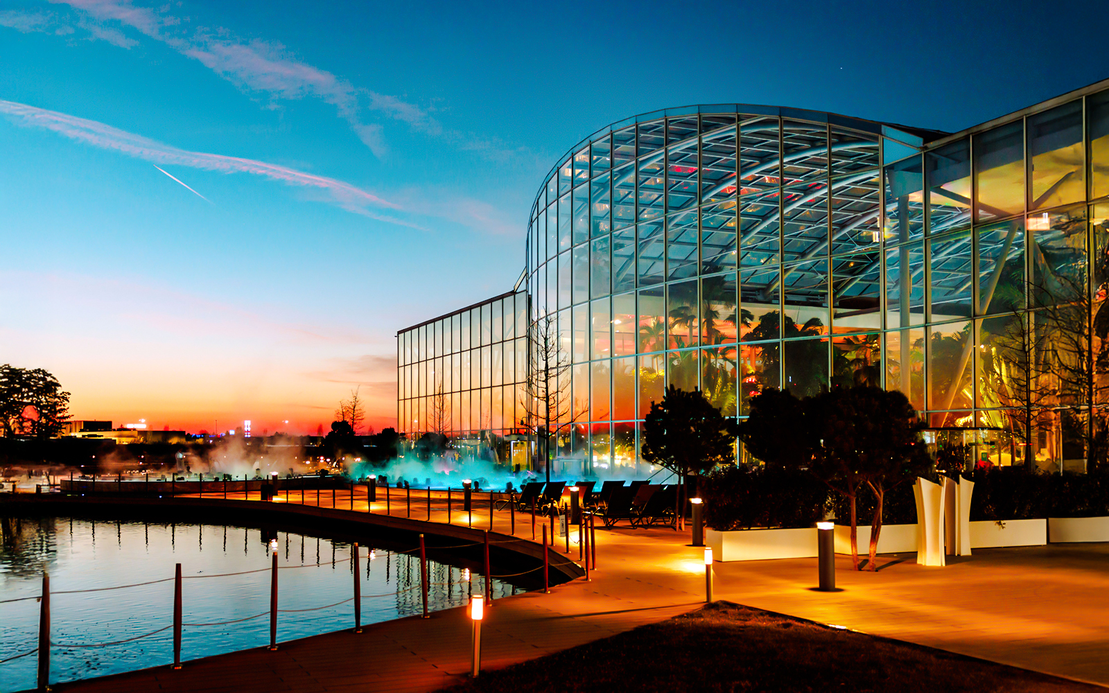 • At The Palm, unwind in a tropical resort-like oasis with over 800,000 plants, indoor and outdoor thermal pools, wet saunas and a natural beach.