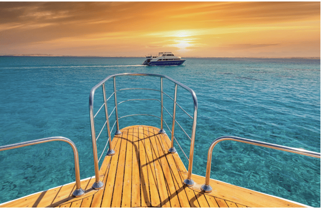 Erlebe das Rote Meer in nur 3 Stunden. Schnorchle an bunten Riffen, genieße Fish & Chips auf einer Yachtfahrt bei Sonnenuntergang und trinke unbegrenzt Erfrischungen, während die Sonne über Hurghada untergeht.
