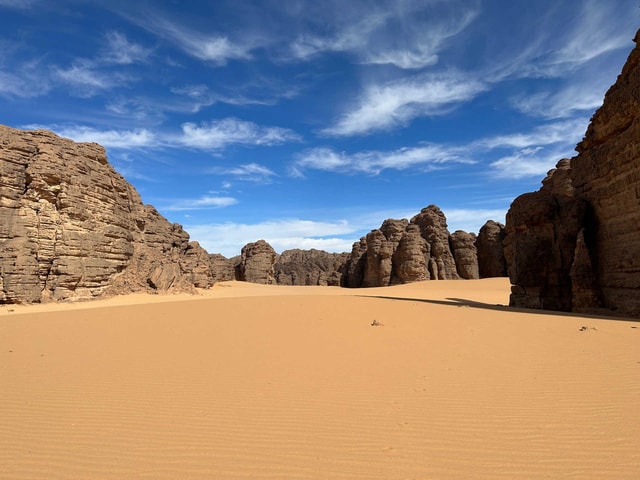 Erkunde die tiefe Sahara bei einer Tour ab der legendären Wüstenstadt Djanet. Entdecke alte Felsgravuren, besuche Naturwunder und tauche ein in die immense und ruhige Schönheit der Wüste.