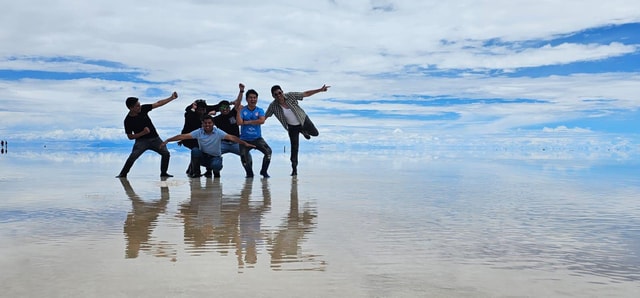 Erlebe die Landschaften des peruanisch-bolivianischen Hochlands, bis du den Salzsee von Uyuni erreichst, wo du ein visuelles Spektakel wie den Spiegel- und Perspektiveneffekt genießen wirst. Mach die besten Fotos.