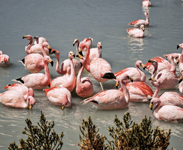 Beobachte rosa Flamingos in den Lagunen Cañapa und Hedionda, Tour in privaten 4x4-Fahrzeugen, Besuch der historischen Kirche von San Cristóbal und der traumhaften Formationen des Valle de Rocas.