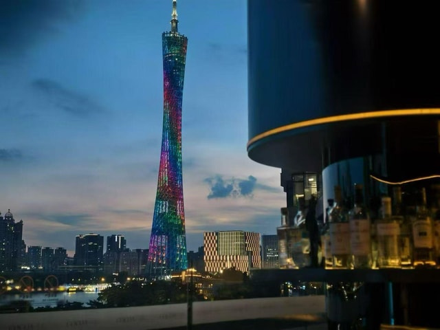 Abseits der Menschenmenge, in der Rooftop Bar im 70. Leckere Snacks und Getränke. Genieße den wunderschönen Sonnenuntergang, die atemberaubende Aussicht auf die Canton Tower Light Show und den Pearl River.