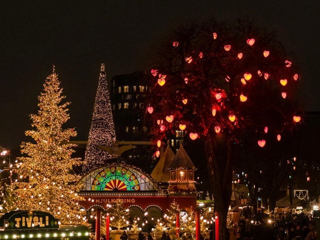 Erlebe den Zauber von Weihnachten im Tivoli in Kopenhagen. Genieße festliche Fahrgeschäfte, kaufe einzigartige Geschenke und gönn dir dänische Weihnachtsleckereien.