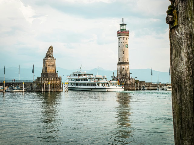 Erlebe die atemberaubende Aussicht in Lindau. Du wirst die bayerische Löwenstatue an der Hafeneinfahrt, einen steinernen Leuchtturm am See, den Diebesturm und die Kirche St. Peter sehen.