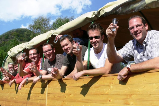 Ausflug mit Schifffahrt von Cochem in einen Moselort, Planwagenfahrt durch Weinberge mit Weinausschank, Essen im Weingut samt Tischgetränken und Rückfahrt per Schiff nach Cochem.