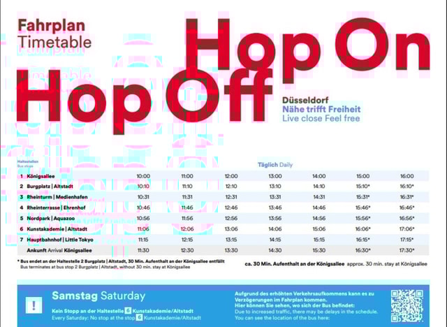 Haltet an der Lichtbrücke auf der Königsallee (gegenüber von Cartier) Ausschau nach jemandem, dem ein Stadtpfade Ausweis am Hals baumelt.