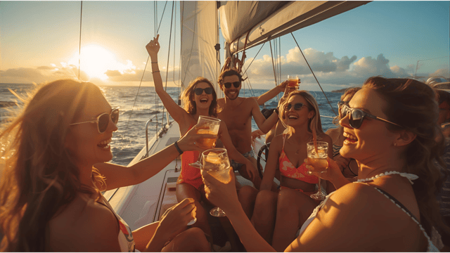 Kulinarische Party bei Sonnenuntergang in Punta Cana auf einem Luxus-Katamaran