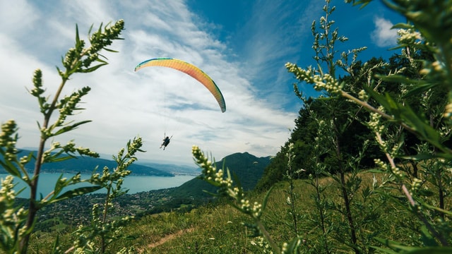 Entdecke das Gleitschirmfliegen auf sanfte Weise bei einem ruhigen Morgenflug über dem See von Annecy. Fotos und Videos gratis!