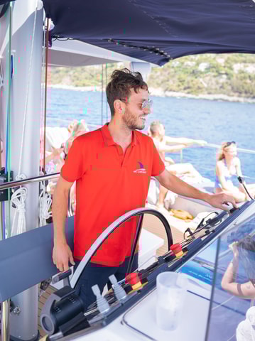 Sea, Brunch & Sun ab Nizza an Bord des Maxi-Katamarans Mayba. Segeln nach Saint-Jean-Cap-Ferrat, Ankern mit Paddel, Schnorcheln und einem Glas Prosecco, dann Brunch mit Blick auf das Meer. Alles inklusive.