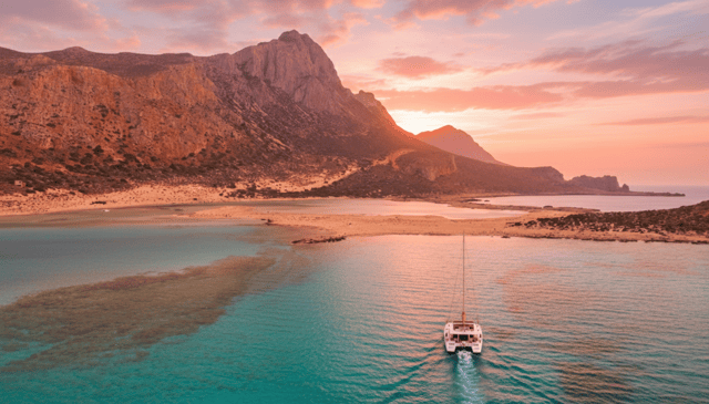 Segle mit einem komfortablen und modernen Segelkatamaran zur exotischen Lagune von Balos. Schwimm im kristallklaren Wasser. Genieße Gourmet-Köstlichkeiten und bewundere den legendären Sonnenuntergang in einem atemberaubenden Moment.