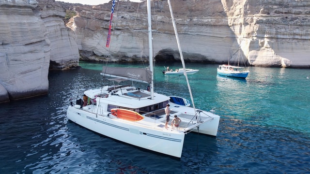 Buchen Sie noch heute Ihre Lagoon Power Catamaran Kreuzfahrt für einen exklusiven 5-stündigen Segeltörn nach Milos und entdecken Sie stilvoll die natürliche Schönheit der Insel.