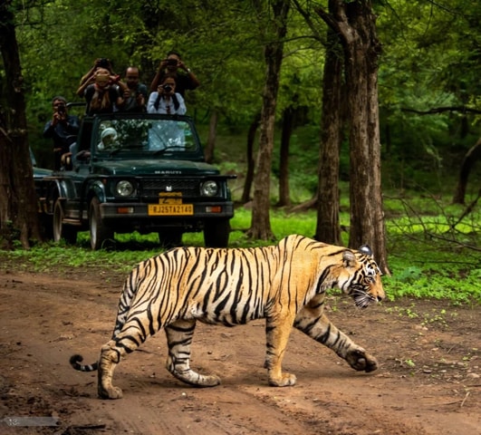 Eine Dschungelsafari in Ranthambore bietet die Möglichkeit, die beliebten Tiere wie den Royal Bengal Tiger und die natürliche Schönheit zu beobachten, die Sie bequem mit Ihren Lieben in einem Jeep oder Galopp genießen können. Während dieser Safaris kann man sich auf den offenen grünen Wiesen von Waldgebieten und Ruinen der Geschichte im Park freuen.