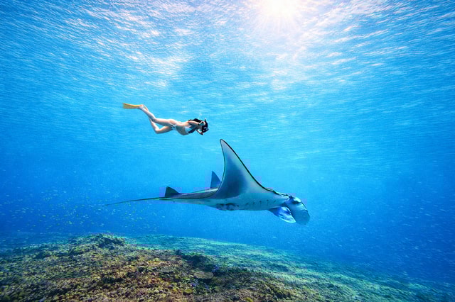Außerdem können Sie sicher mit Mantarochen und Mondfischen (besser bekannt als Mola Mola) schwimmen!