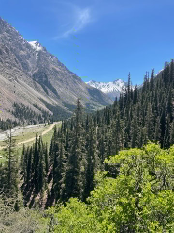 Erlebe den majestätischen Blick auf das Tian Shan-Gebirge vom Ala Archa Park aus. Wandere entlang des alpinen Flusses und des Waldes in der Schlucht. Genieße einen Spaziergang durch den Park, umgeben von schneebedeckten Bergen