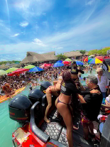 Erlebe das Party-Erlebnis von Cartagena auf einem Sportboot. Musik, Bier an Bord, Halt im Ibiza Beach Club und Rumba in Cholón, dem Epizentrum der Party auf den Inseln von El Rosario.