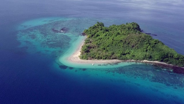Das sind zwei Inseln, die durch einen Streifen sehr weißen Sandes verbunden sind, der von klarem, türkisfarbenem Wasser umspült wird.