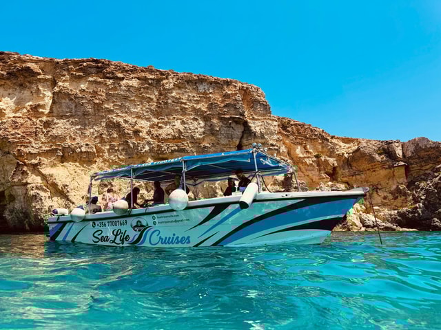 Erlebe eine Motorbootfahrt von Sliema aus und erkunde die Crystal Lagoon, die Blu Lagoon, den Ħalfa Rock in Gozo und die nahe gelegenen Höhlen. Schwimme im Meer, entspanne dich und kühle dich im Schatten des Bootes ab.
