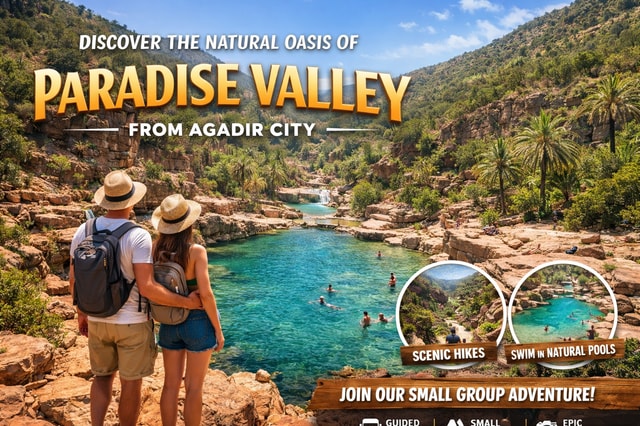 Wir starten um 8:30 Uhr und fahren in den Norden von Agadir, wo das Wasser ununterbrochen fließt und es das ganze Jahr über grün ist. Bei einer Fahrt durch das Paradiestal siehst du eine Vielzahl von Landschaften mit kontrastreichen Farben, bevor du eine Pause in den natürlichen Pools einlegst.