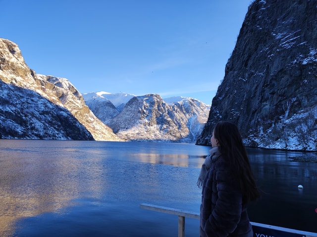 Erlebe die Schönheit der norwegischen Winterlandschaft auf einer Hin- und Rückfahrt ab Bergen. Genieße eine Bootsfahrt auf der UNESCO-Welterbestätte Nærøyfjorden und besuche den Aussichtspunkt Stegastein in Aurlandsfjellet.