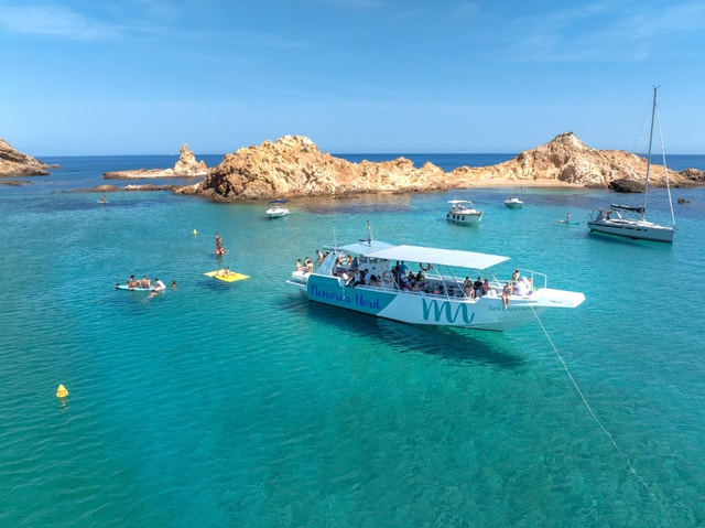 Erkunden Sie Menorcas atemberaubende Südküste, besuchen Sie berühmte Strände und schnorcheln Sie im klaren Wasser. Buchen Sie jetzt Ihre entspannte Bootstour.