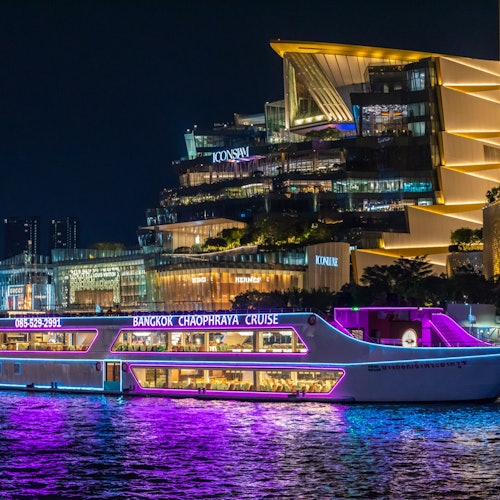 • Alternativ können Sie sich auch für die klimatisierten Zimmer oder die Dachterrasse und den Bug im Asiatique Pier 2 oder IconSiam Pier 4 entscheiden, wo Sie ein Meeresfrüchtebuffet, eine traditionelle thailändische Tanzshow und Kabarettvorstellungen erwarten.