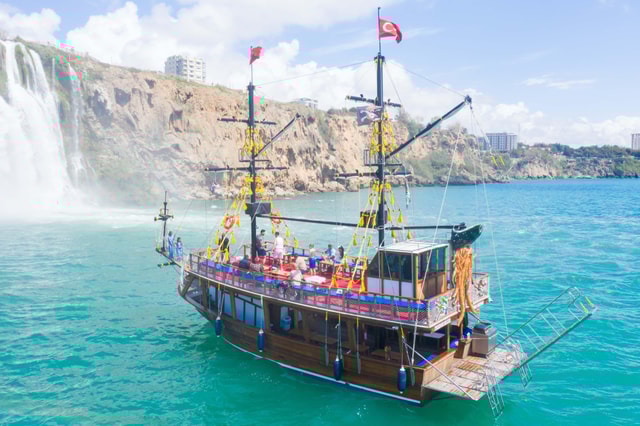 Genieße eine entspannende oder lustige Piraten-Bootstour ab Antalya und Belek. Besuche den Düden-Wasserfall, die Höhlen der Lara-Bucht, genieße zwei Schwimmstopps, Mittagessen an Bord, Softdrinks und Hoteltransfers inklusive.