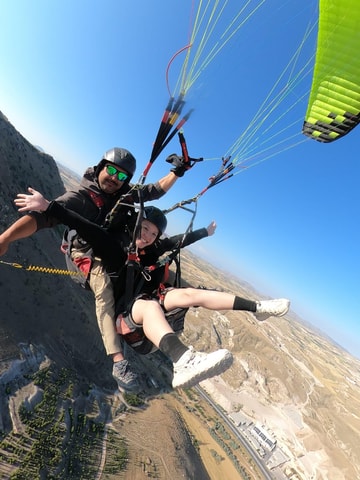 Gleiten Sie bei einem aufregenden Tandem-Paragliding-Abenteuer über die einzigartigen Landschaften Kappadokiens.