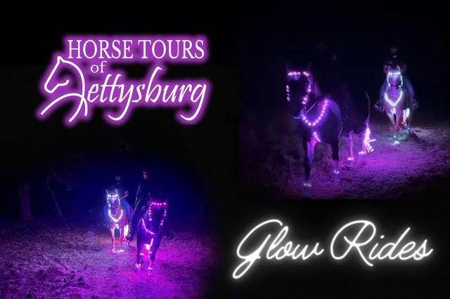 Erlebe die Magie von Gettysburg bei einem 35-minütigen Glow Ride. Reite auf einem leuchtenden Pferd durch sanft beleuchtete Waldwege und schaffe unvergessliche Erinnerungen unter dem Nachthimmel.