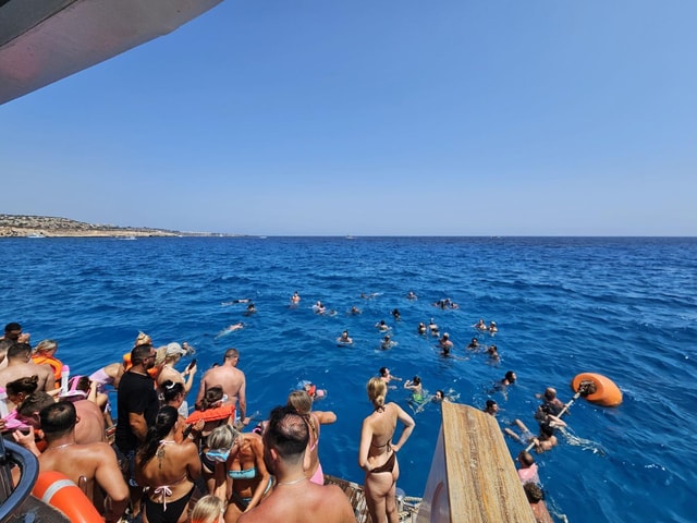 Erlebe das kristallklare Wasser von Protaras auf einem 32 Meter langen Napa King-Boot. Genieße Badepausen in der Lagune von Cape Greco und in der Turtle Cove.