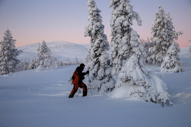 Discover the unknown trails of Urho Kekkonen National Park on a snowshoe tour. Walk on your own trails outside the marked routes and enjoy the snowy trees.