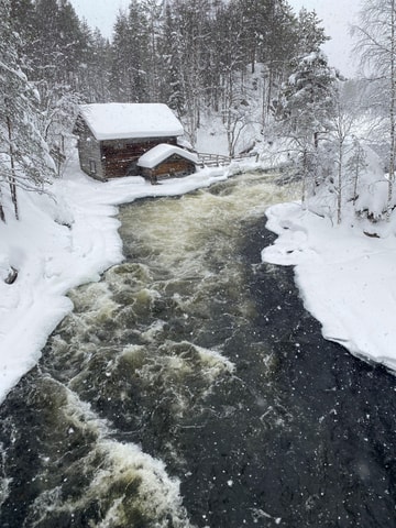 Explore Oulanka National Park on a snowshoeing tour from Ruka. Discover snow-covered forests, see the Myllykoski rapids, and enjoy hot chocolate and pastries by an old mill.