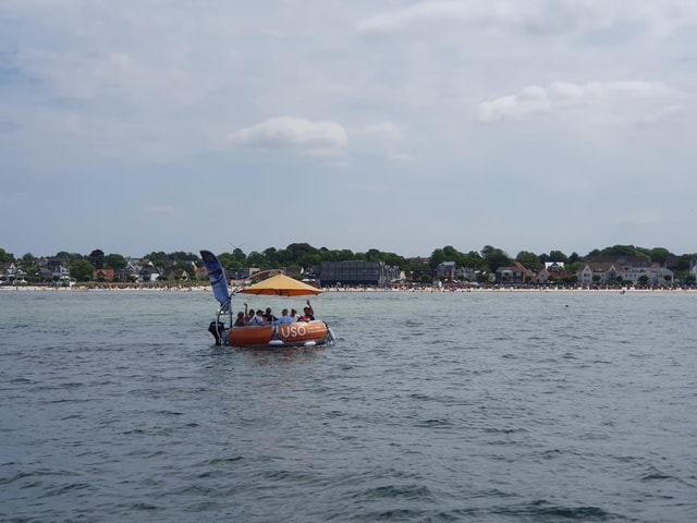 Fun with friends! Experience an unforgettable time with USO off the coast of Laboe with friends and family, enjoying fish sandwiches and cool drinks.