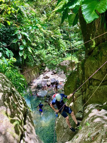 A canyon descent in the heart of the tropical forest. 3 rappels, jumps, and slides in crystal clear water! In a small group. From 12 years old.