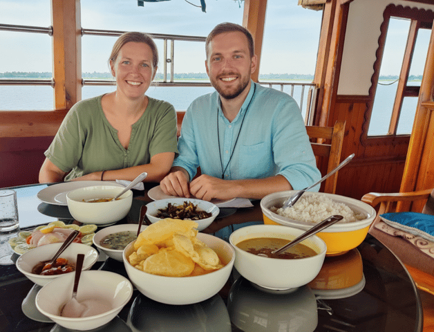 Experience the beauty of the backwaters of Kerala on a houseboat cruise. Enjoy a set menu lunch, dinner, and breakfast on board the boat.