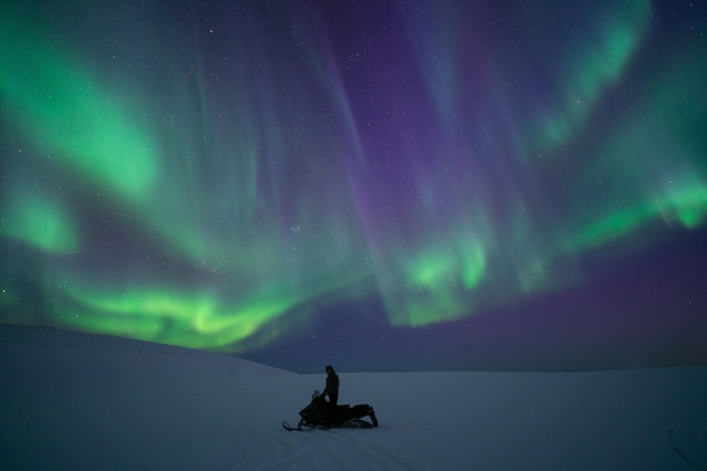 Embark on a private snowmobile tour as passenger from Longyearbyen to see the Northern Lights. Drive through the Arctic wilderness, stop at remote locations, and enjoy hot drinks and snacks.
