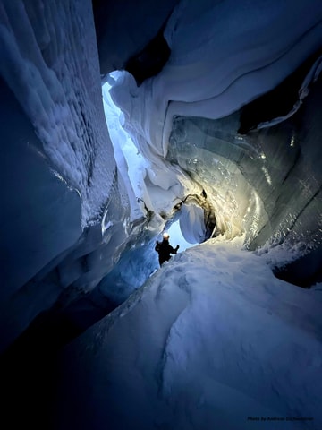 Travel through Svalbard winter wilderness by snowmobile to reach a hidden ice cave carved deep into the glacier. Explore frozen waterfalls, glowing blue chambers in an unforgettable Arctic experience