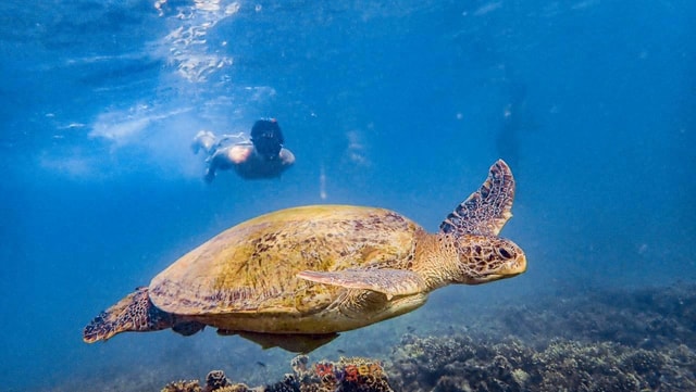 Embark on a unique sunset snorkel experience! Enjoy the crystal-clear waters while exploring marine life, all under the warm golden light of the sun as it hides on the horizon.