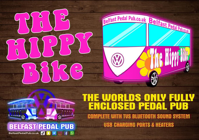 The Hippy Bike is the worlds’ first and only fully enclosed 12-seater pedal pub and its home is proudly here in Belfast! Fully protected from wind and the rain to ensure you'll still be looking GLAM