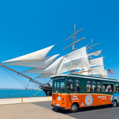 • Sunny San Diego is calling! Glide by the coastal cliffs and glistening bay with this 1/2-day hop-on hop-off trolley tour and delight in the city's top sights.