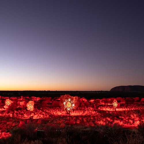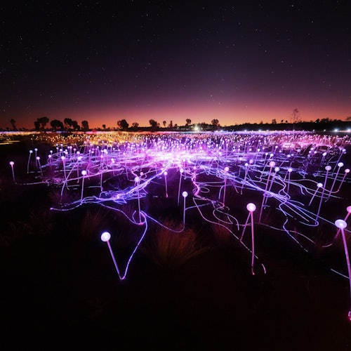 Encuentra el impactante Campo de Luz del artista Bruce Munro, una obra inspirada en un viaje a Uluru. Contempla una obra de arte instalada en una remota zona desértica a la vista de la majestuosa roca.