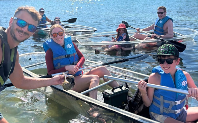 Explora la belleza de la costa del Golfo de Sarasota en una aventura guiada en Clear Kayak Beach Hopping. Reme a través de aguas cristalinas en un kayak transparente, que ofrece una vista inigualable de la vibrante vida marina a continuación.
