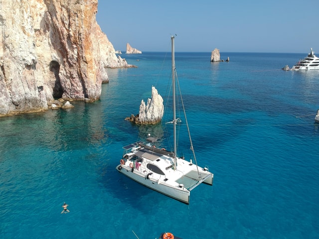 Alquilar un barco en Milos es un plan ideal para surcar las aguas turquesas de esta isla de las Cícladas. Podréis elegir si queréis ir con o sin patrón a bordo.