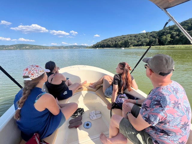 Navega por las orillas del lago Trasimeno en un tour privado en barco con patrón. Disfruta de una experiencia única en un barco Trimarchi 57S, perfecto para una ocasión especial o una excursión de un día.
