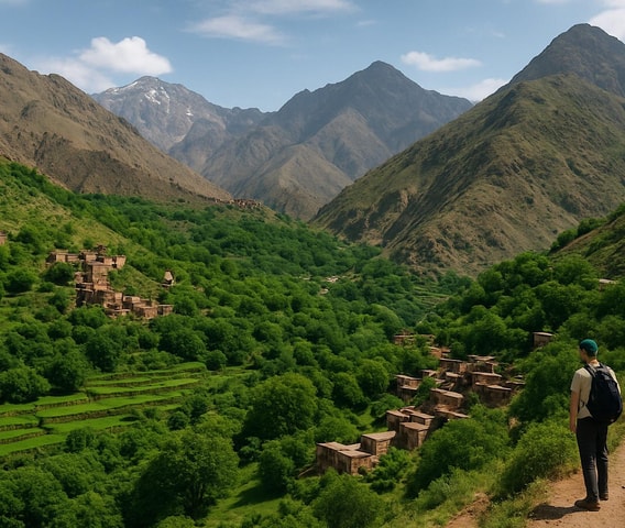 Acompáñenos, Mustapha y Bouchouaou, guías locales de un pueblo bereber tradicional cerca de Imlil, en un recorrido panorámico y cultural por el Alto Atlas. Este recorrido le llevará por auténticos pueblos amazigh, verdes valles y nogales, y le ofrecerá impresionantes vistas del monte Toubkal, el pico más alto del norte de África.