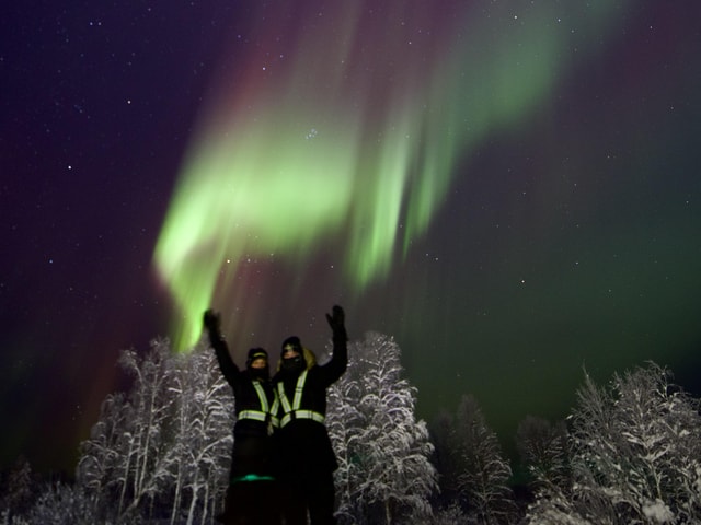 Chaussez vos raquettes et partez à la découverte des aurores boréales dans les forêts d'Äkäslompolo. Profitez des paysages nordiques dans l'obscurité !