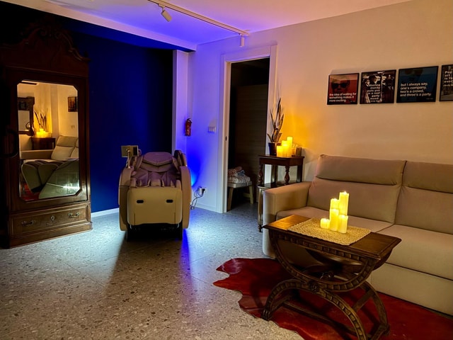 Spa privé comprenant sauna, hammam, bain à remous, fauteuil de massage, salle de sport, coin bar et coin détente