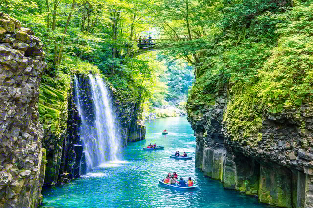 Découvrez la magie de Kyushu lors d'une excursion d'une journée. Visitez le sanctuaire Kamishikimi Kumanoimasu, le sanctuaire Amano Iwato et les gorges de Takachiho. Découvrez la mythologie japonaise et admirez les trois ponts emblématiques de Takachiho.