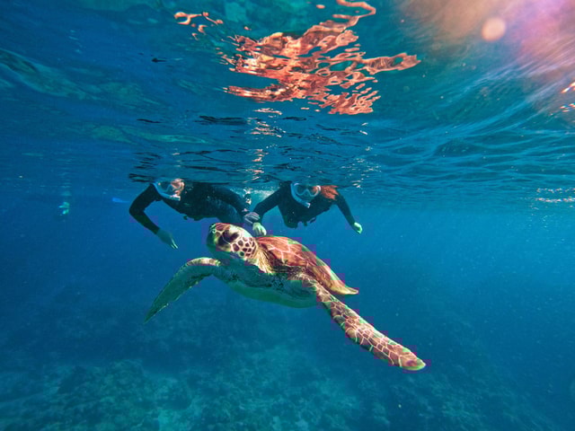 Plongée en apnée avec des tortues marines par un Guide parlant Anglais couramment. 97% d'observations de tortues ! Ramassage gratuit, photos et vidéos.