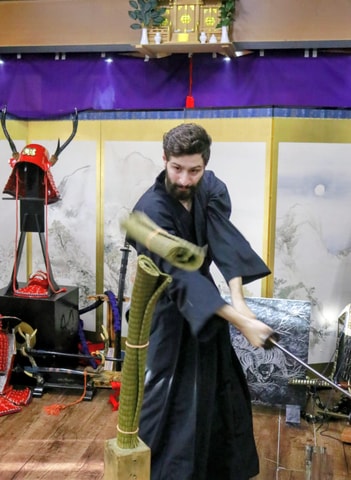 Apprenez la posture de base, la technique de maniement et les dangers du katana de samouraï auprès d'un maître. Initiez-vous à la coupe au katana avec un véritable katana de samouraï ! Vivez l'expérience de la meilleure performance de coupe au monde.